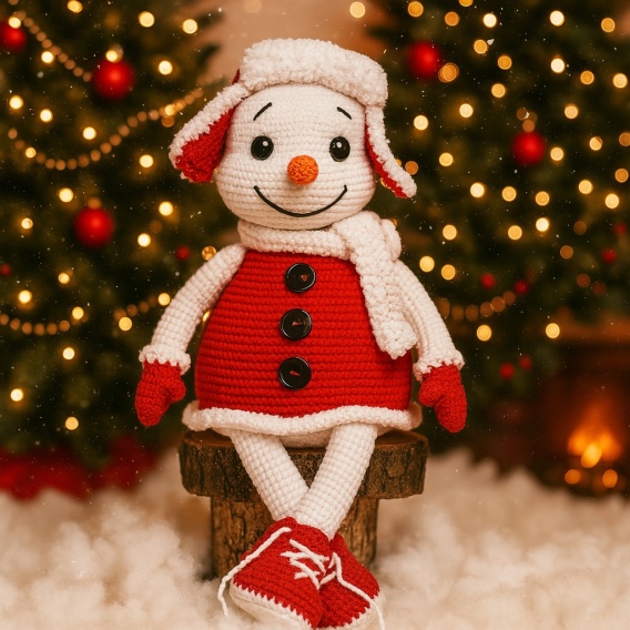 Bałwanek ma 30cm wysokości i zrobiony jest z mieszanki bawełny i akrylu. • Sugerowana włóczka: (La Passion Holly, Yarn Art Jeans, Alize Cotton Gold, Etrofil Jeans, itp.). Włóczka pluszowa ( Happy Chanille, Mink itp). Wszystkie wymienione włóczki mają podobną grubość i skład i można ich używać zamiennie. Kolory włóczki użyte w projekcie: biały i czerwony po ½ motka, czarny do wyszycia brwi i rzęs. Kilkanaście metrów cienkiej włóczki pluszowej w kolorze białym. • Bezpieczne oczka 12 mm. • 2 guziki. • Kulka silikonowa do wypełnienia. • Szydełko 2 mm. • Gruba igła.